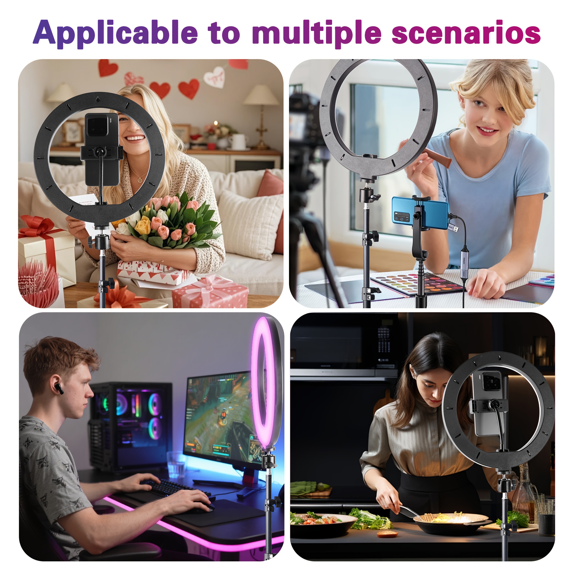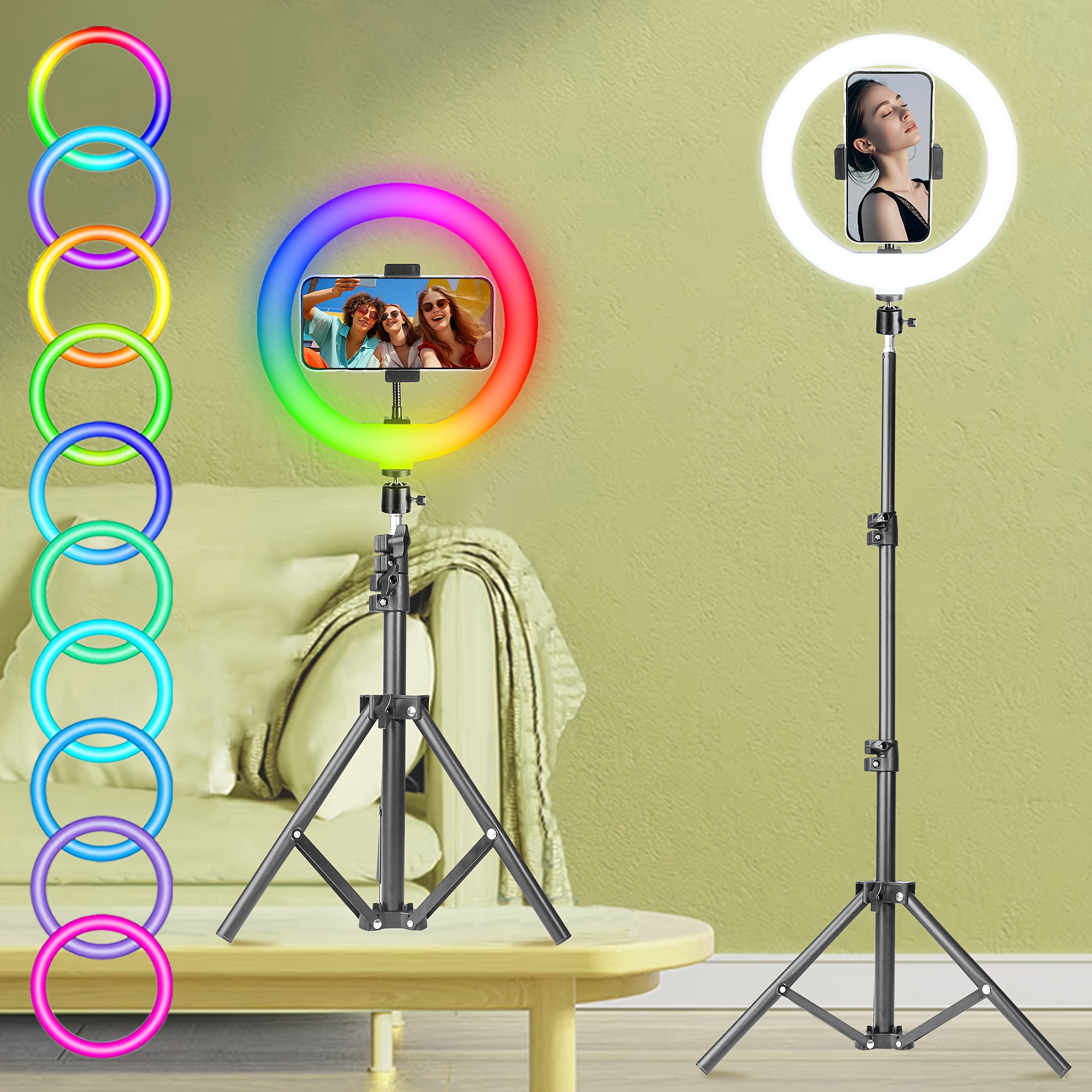 10 Inch Selfie Ring Light with 43 Inch Adjustable Tripod Stand & Phone Holder - Dimmable LED Ring Light with RGB Color Adjustable Light Levels, Portable -Powered Circular Flashlight for Vlogging, Streaming, -Powered