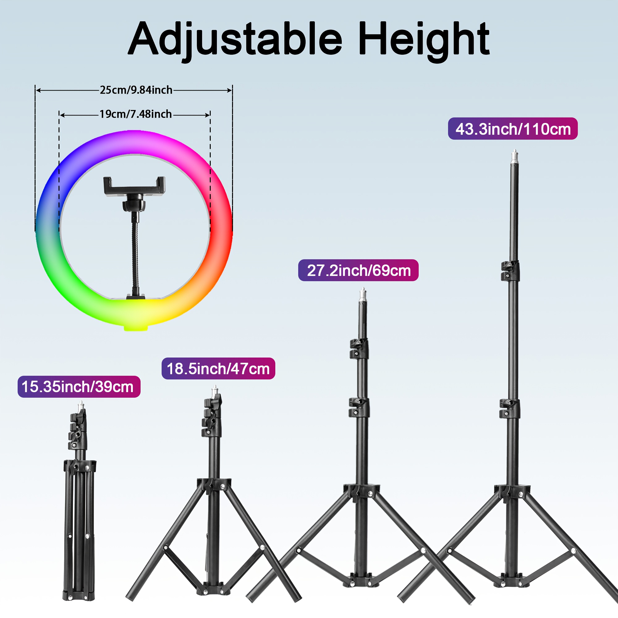 10 Inch Selfie Ring Light with 43 Inch Adjustable Tripod Stand & Phone Holder - Dimmable LED Ring Light with RGB Color Adjustable Light Levels, Portable -Powered Circular Flashlight for Vlogging, Streaming, -Powered